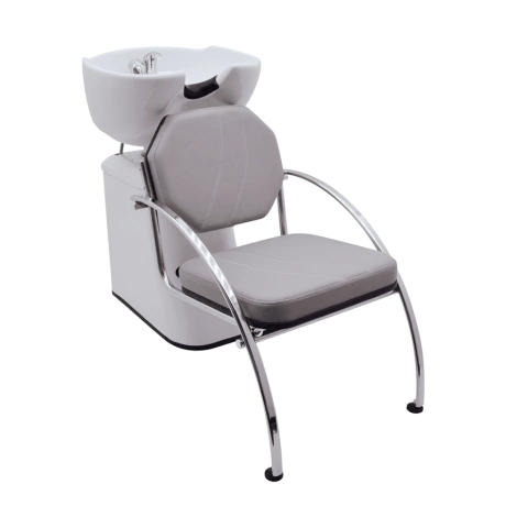 Lavatório com cuba móvel, fabricada em estrutura de tubo aço carbono cromado, encosto e assento de espuma laminada de alta densidade, tecido de couro ecológico de alta resistência, disponível em diversas cores, coluna em fibra de fibra de vidro, cuba em louça esmaltada, registro em metal monocomando cromado, ducha em plástico de engenharia, mangueiras em PVC flexível revestido em malha de aço.
